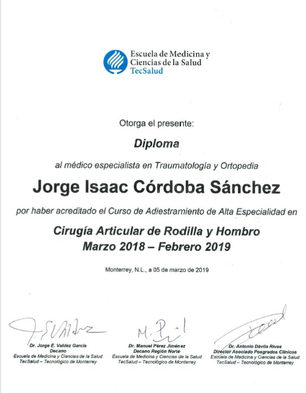 Soy el Dr. Jorge Isaac Córdoba Sánchez, especialista en Ortopedia y Traumatología, egresado del Instituto Tecnológico y de Estudios Superiores de Monterrey (ITESM), uno de los hospitales más importantes en la formación de médicos cirujanos.